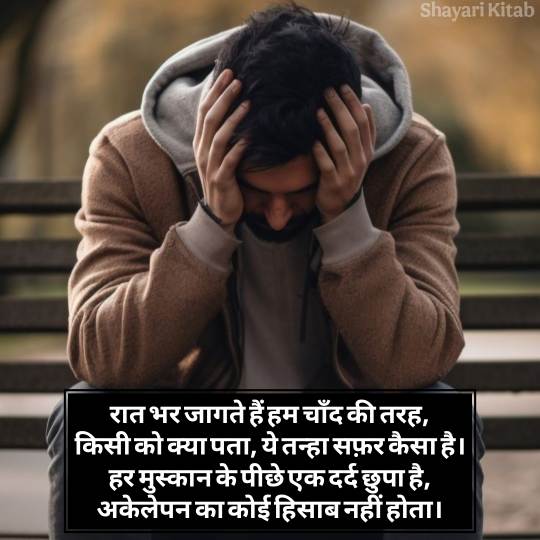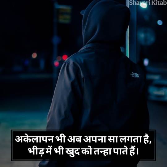 अगर आप भी आजकल अकेलापन महसूस करते हैं तो आपको अकेलापन अलोन शायरी जरूर पढ़नी चाहिए। अकेलेपन पर लिखी गई शायरियाँ न सिर्फ दिल को सुकून देती हैं, बल्कि यह एहसास भी कराती हैं कि कोई और भी है जो हमारी तरह महसूस करता है। Alone Shayari दिल की गहराइयों से निकलती हैं और सीधे दिल को छू जाती हैं। यह अकेलेपन को कम तो नहीं करतीं, लेकिन उसे सहने की ताक़त जरूर देती हैं। इस Alone Love Shayari को आप अपने व्हाट्सएप स्टेटस पर जरूर लगाए ताकि आपके स्टेटस को पढ़कर हर कोई यह जान सके कि आजकल आप कितना अकेलापन महसूस कर रहे हैं।