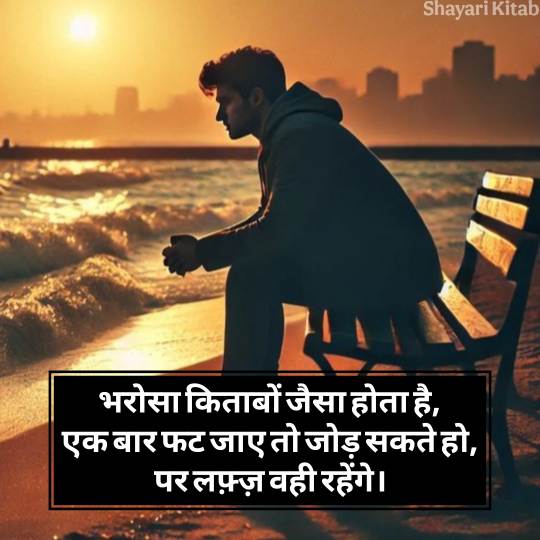 इन शायरियों में दर्द, पछतावा और टूटे विश्वास की टीस होती है। ऐसी Bharosa Todne Wali Shayari लोगों के लिए आईना बनती है, जिन्होंने अपनों से धोखा खाया है। यह केवल शब्दों का खेल नहीं, बल्कि टूटे दिलों की सच्ची आवाज़ है। शायरी के इन अल्फाज़ों में वह तड़प होती है जो व्यक्ति को अंदर से हिला देती है, और उसी में कहीं एक सुकून भी छुपा होता है। अगर आपका भी किसी ने भरोसा जीत कर तोड़ दिया है तो आप इस शायरी को जरूर पढ़ें।