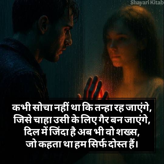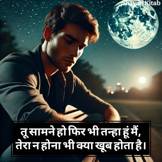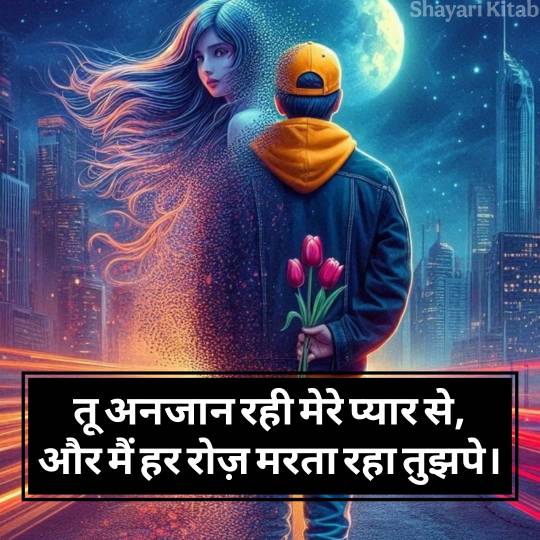 एकतरफा प्यार शायरी २ लाइन उन लोगों के लिए एक सहारा बन जाती है, जो अपने प्यार को कह नहीं पाए। वे शायरियों में अपने दिल की बात ढूंढते हैं और उस अधूरे प्यार को शब्दों में जीते हैं। इसीलिए एकतरफा प्यार की शायरी सिर्फ लफ्ज़ नहीं, बल्कि अधूरी मोहब्बत की ज़िंदा कहानी होती है। यह Ek Tarfa Pyar Shayari आप अपने व्हाट्सएप स्टेटस पर जरूर लगाए।