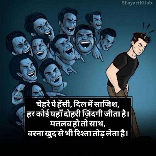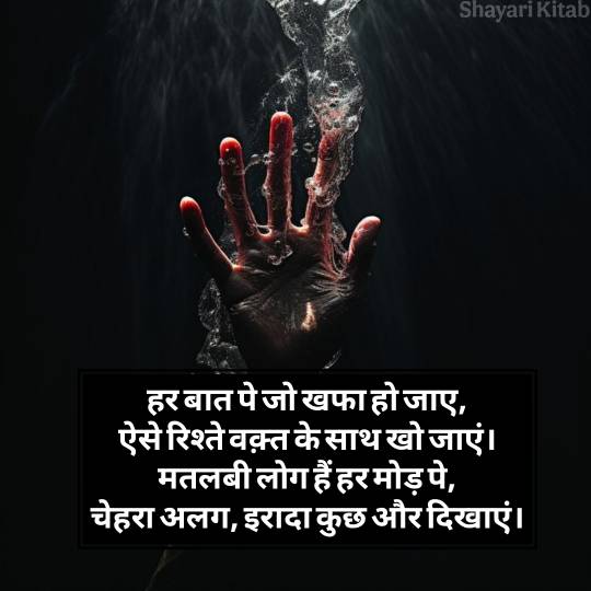 मतलबी लोगों पर लिखी मतलबी लोग शायरी अक्सर तजुर्बे का नतीजा होती हैं। जब किसी अपने से धोखा मिलता है, तब इंसान अंदर से टूट जाता है, और वही दर्द शायरी की शक्ल में बाहर आता है।